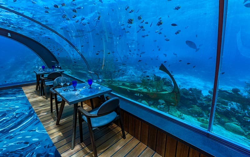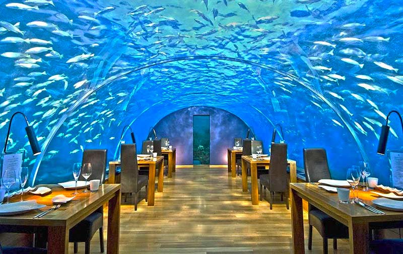 L’Ithaa Undersea Restaurant (foto in basso a destra), compreso nel resort Conrad Maldives Rangali Island, è il primo ristorante subacqueo del mondo: fu aperto nel 2005. La sua struttura è molto particolare: si tratta di una cupola con vista a 180 gradi attraverso cui si vede la barriera corallina incessantemente “frequentata” dai pesci tropicali. Tra i piatti più gettonati, i paccheri ripieni di porcini serviti con vellutata di mozzarella di bufala, carciofi croccanti e polvere di pistacchio.