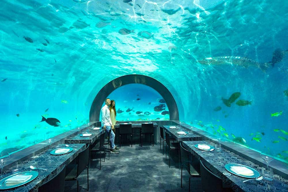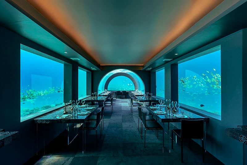 Il 5.8 (foto in basso a sinistra), che si trova a 5.8 metri di profondità, è tappa fissa di numerosi vip in vacanza alle Maldive e ospiti presso il resort Hurawalhi. Non fatevi però ingannare dalla pubblicità, che lo spaccia come il ristorante sottomarino più grande del mondo quando in realtà può contenere al massimo dieci coppie. Insomma, l’ideale di questi tempi Covid ma non propriamente accessibile a tutti i portafogli: il pranzo si aggira sui 225 dollari, la cena tocca i 280.