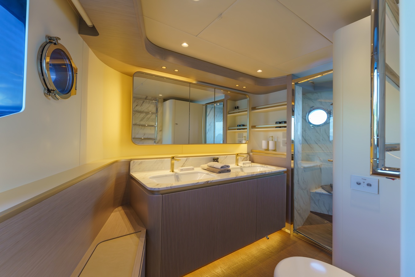 Gli interni riflettono la cura maniacale tipica del cantiere. Il main deck è un ambiente luminoso e arioso, grazie alle grandi vetrate a tutta altezza che annullano la separazione con il mare. La cucina, disposta a U, è completamente attrezzata e si apre verso il salone, dove due ampi divani e un tavolo centrale creano un’atmosfera conviviale. I materiali scelti (legni chiari, marmi naturali e tessuti morbidi) esprimono eleganza e comfort senza eccessi, con una coerenza stilistica che caratterizza tutta la gamma Absolute. La cabina armatoriale, posizionata a mezza nave, è un capolavoro di design e comfort. Il letto king size è orientato verso le grandi finestrature laterali, che regalano una vista mozzafiato sul mare. Il bagno privato, ampio e raffinato, è rifinito con materiali di pregio e include una doccia walk-in a tutta altezza. Completano la zona notte una cabina VIP a tutto baglio a prua e due cabine ospiti doppie, tutte con bagno privato. Gli spazi sono generosi, le finiture di altissimo livello e la privacy garantita in ogni ambiente. Anche la cabina equipaggio, con accesso separato, è progettata con attenzione e cura.