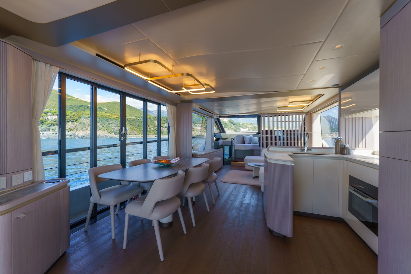 La spiaggia di poppa è una delle aree più spettacolari. La piattaforma idraulica può scendere fino al livello dell’acqua, creando un vero beach club dove rilassarsi, fare il bagno o gestire tender e giochi d’acqua. È il cuore della vita a bordo durante le giornate d’estate, collegato in modo fluido al pozzetto principale, che ospita una dinette riparata e un mobile cucina attrezzato con grill, frigorifero e lavello.