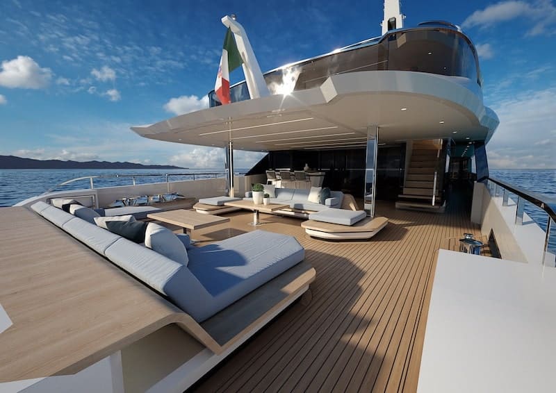 Il tender principale è sistemato in un garage sottocoperta mentre, all’estrema poppa, è stato ricavato un ampio beach club con piattaforma idraulica a sbalzo.