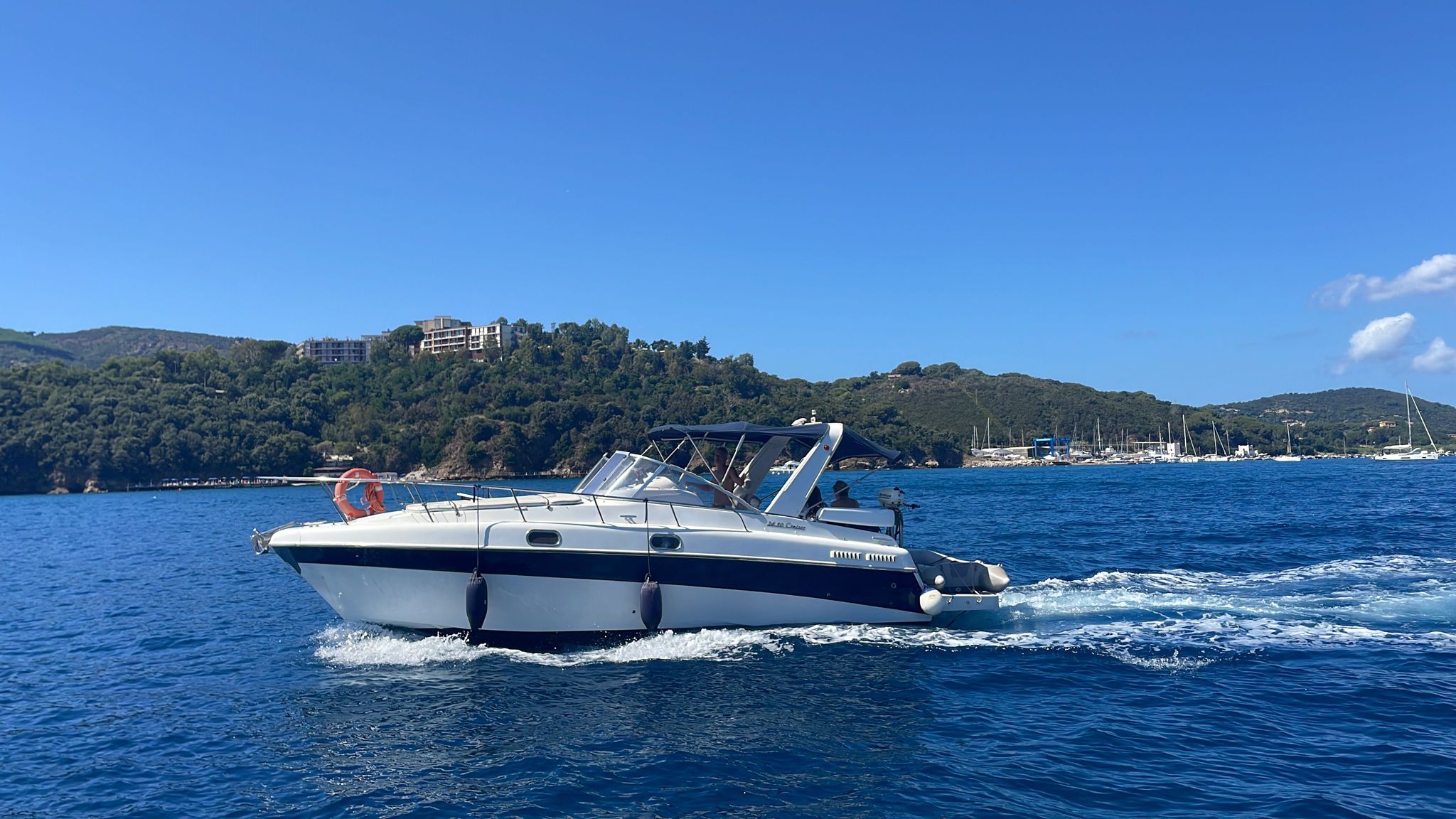 Approval and safety equipment Cat.B: Offshore within 20 miles CE Marked Dimensions and interiors: Length 9.1 m; Beam 2.85 m4 berths; 4 berths; 2 cabins; 1 bathroom; forward V-cabin dinette – separate bathroom – aft cabinPropulsionVolvo, 2 x 170 hp, Diesel tank 350 litersAccessories/Logistics4 Batteries, 1 for each engine and 2 for services; Voltage: 12/220; Battery charger; Galley; Fridge – Water tank: 100 lt; Autoclave; Boiler; Indoor shower; Outdoor shower VHF; Gps; Echo; Electric anchor windlass teak swim platform – full cushions – camper hood and awning