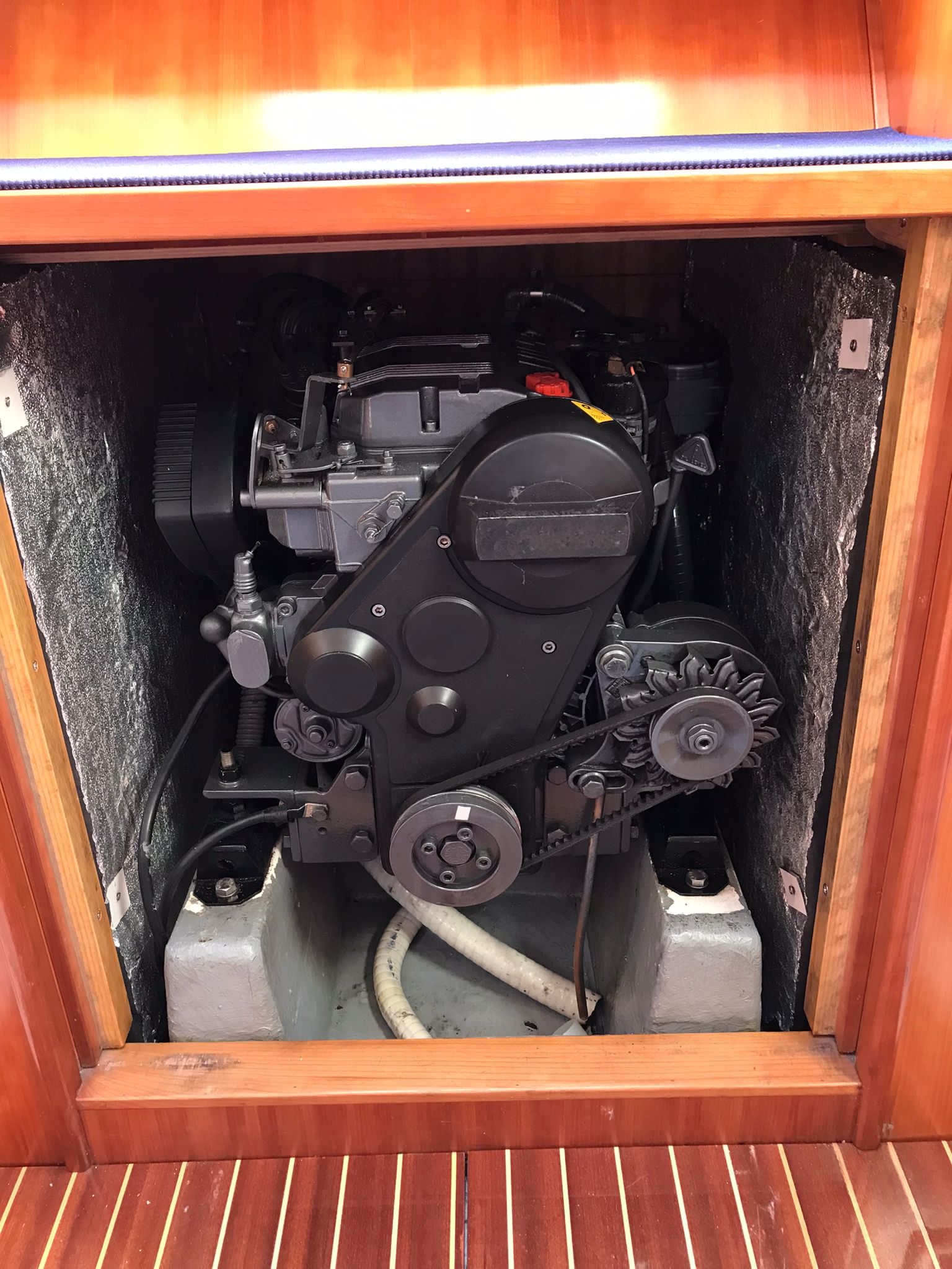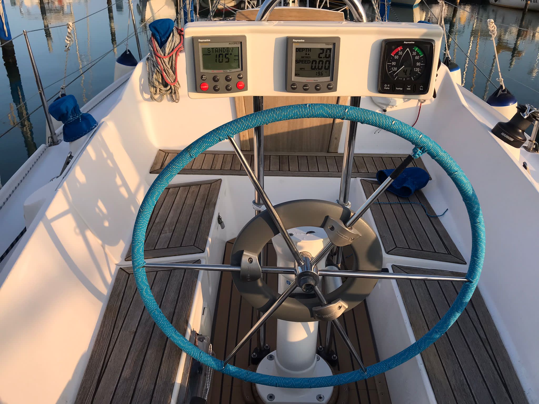 COVER- Blue Wave rigging from G&.G Rigging (June 2023)- Quick Italy 700 W electric anchor windlass (windlass), with 25 mt chain + 12 mt line (June 2023), with 10 kg galvanized Bruce anchor- 1 gennaker (white and blue center star) with associated sheets and pulleys- 1 genoa in 138% smoked pentex biradial- 1 mainsail in smoked pentex triradial- full batten- 2 coats of reefing- 1 genoa in dacron 138%- 1 mainsail in dacron – full batten- 2 coats of reefing- 1 gennaker (white and blue center star)- 1 bowsprit to be mounted if necessary on the bow thruster for the gennaker- 1 folding oak table to be mounted on the wheelhouse console- Raymarine ST4000+ autopilot, Raymarine ST60 tridata and Raymarine i60 wind station- 1 tiller for rudder- outside compass- outside freshwater shower- 1 outside awning made of stainless steel tubing and blue fabric- 1 awning extension