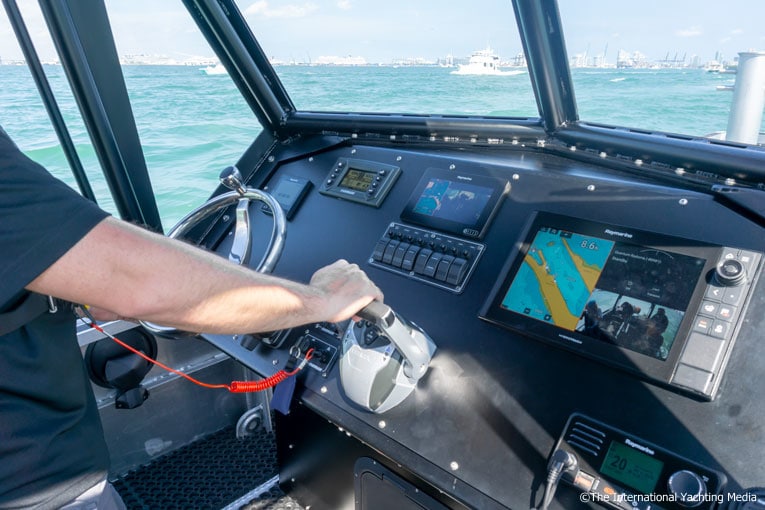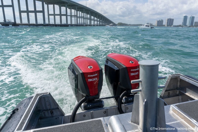 Evinrude 300 MotoriAbbiamo voluto testare durante il Boat Show di Miami, il motore più potente della serie: l’ Evinrude E-TEC G2 300  HP V6 da 3,4 L.Per effettuare il nostro test abbiamo scelto un’imbarcazione inusuale, uno Zodiac Milpro SRA 900.Lo Zodiac Milpro SRA 900 è un’imbarcazione professionale, studiata in particolar modo per affiancare le forze governative, come la guardia costiera.