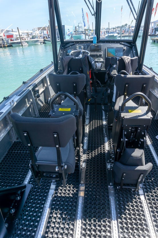 Zodiac-Mill-Pro-sra-900_1Zodiac Milpro SRA 900-SeduteSalgo a bordo e ad accogliermi c’è Jake Albinio, di Zodiac Milpro ed ex membro della Guardia Costiera, che mi illustra con dovizia di particolari l’imbarcazione su cui effettueremo la prova.Non ci metto molto a realizzare che è decisamente “tosta”. Lo scafo e la carena sono completamente in alluminio.La carena è anche rinforzata ed è disegnata con lo speciale sistema a due stabilizzatori laterali, per migliorare di molto la manovrabilità negli spazi stretti, ad alte velocità.
