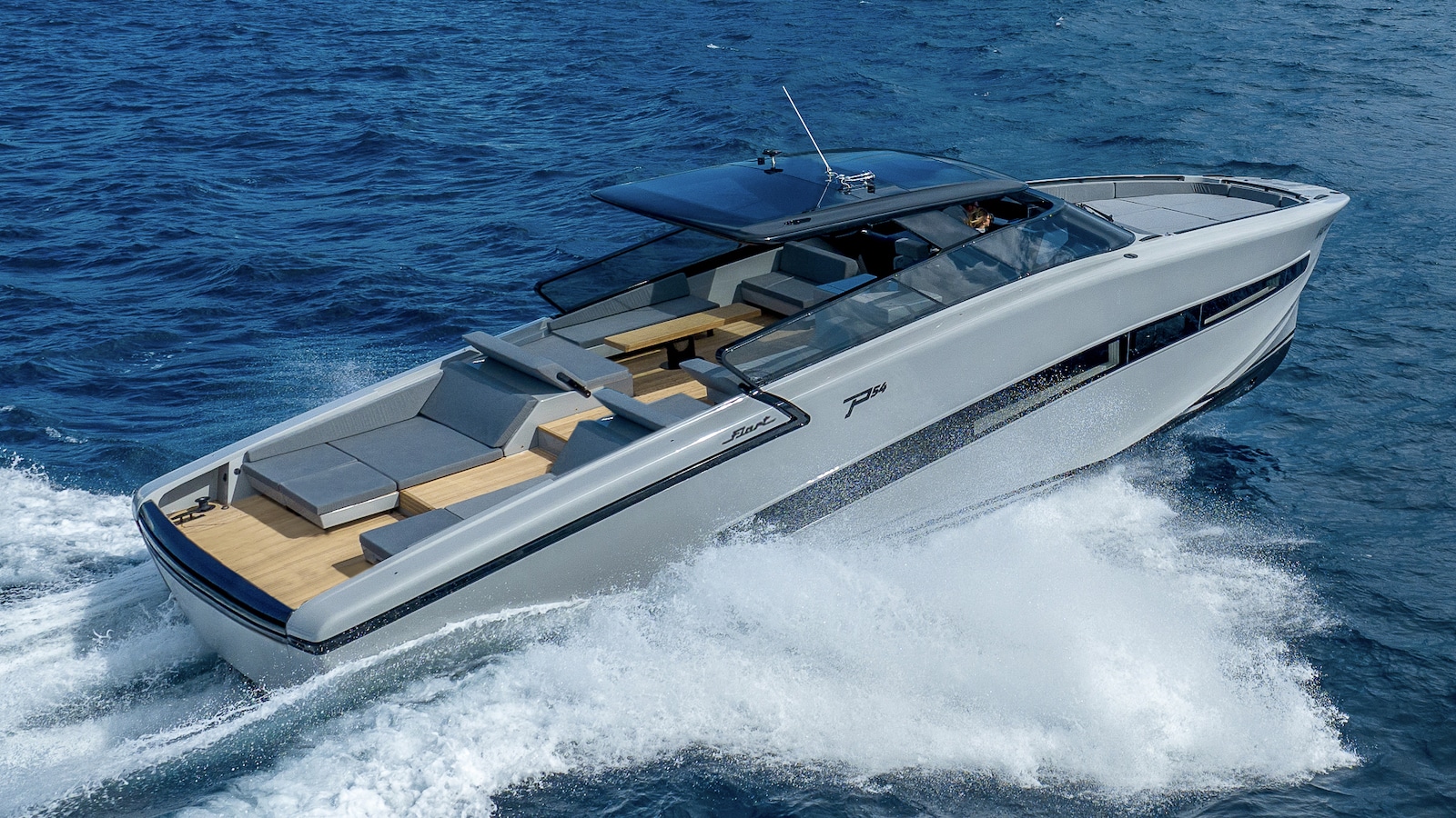 Definire “stiloso” ed innovativo il Fiart P54 sarebbe un eufemismo. Questo yacht è un vero e proprio concentrato di novità stilistiche che non si limitano all’estetica ma, e non è cosa scontata, hanno tutte una precisa funzione d’uso. Basta osservarlo per accorgersene: prua larga che si rastrema fino a diventare finissima a livello dell’acqua, poppa rovescia, profilo del cavallino sbilanciato in avanti e parabrezza a tutto baglio con accesso diretto alla prua. Elementi che, uniti ad un piano di coperta semplicemente meraviglioso, tracciano i contorni di uno yacht votato alla comodità e alla vita estiva all’aria aperta.