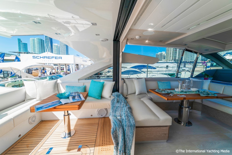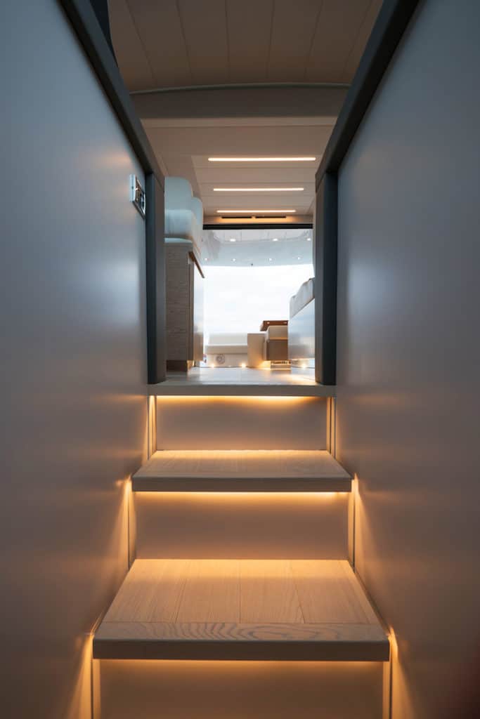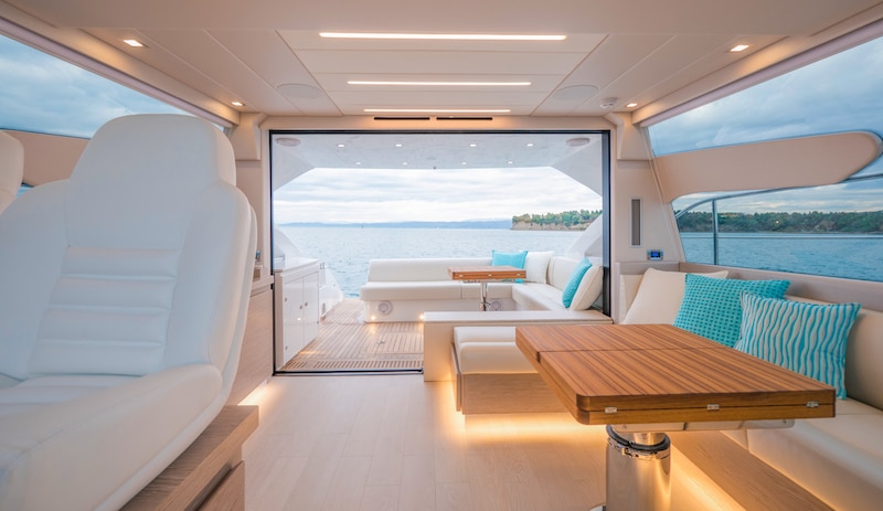 I due grandi soggiorni diventano così un tutt’uno e creano un area immensa che parte dalla postazione di guida ad arriva fino al grande prendisole di poppa, abilitando di fatto un ambiente elegante e raffinato, ideale sia per gli aperitivi al tramonto che per ospitare ricevimenti affollati.