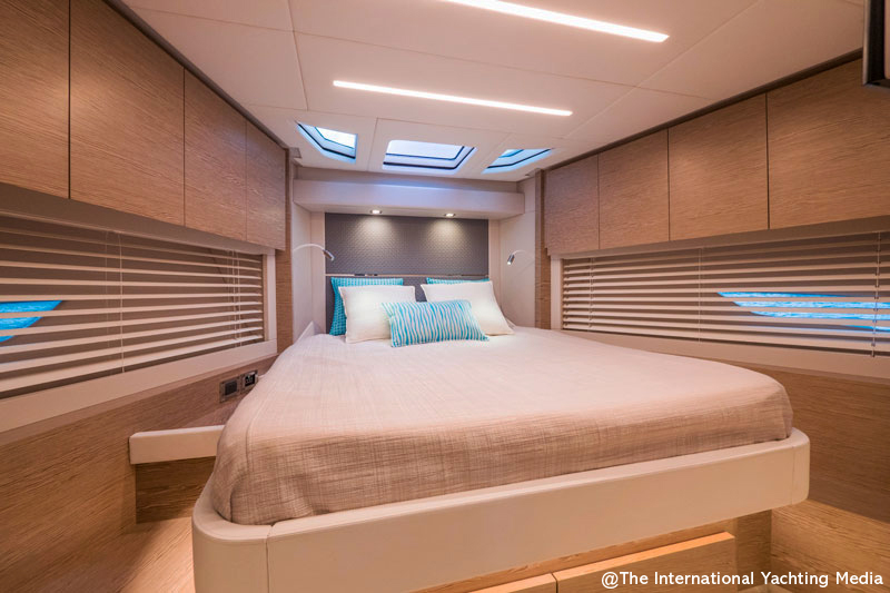 La Master Cabin è disposta per baglio e sfrutta tutti i 4,64 metri di larghezza per offrire un ambiente enorme, esclusivo e raffinato. Qui luci, specchi e finestrature giocano fra loro ad allontanare i confini naturali di questo ambiente che, sapientemente studiato, trova in questo posizionamento il luogo ideale per la dimora dell’armatore.