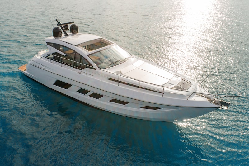 Ne deriva un colpo d’occhio complessivo sublime, al quale basta aggiungere un tocco d’azzurro posizionando pochi particolari d’arredamento,  perché questo yacht raggiunga vette di raffinatezza inaspettate per un’imbarcazione sportiva come questa.