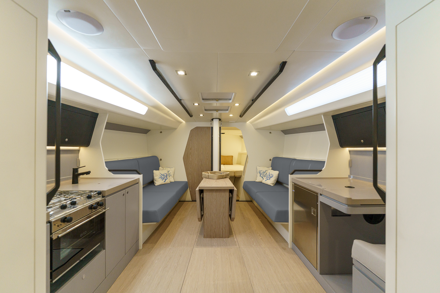 Attualmente in costruzione, l’Ice 52ST ha un layout open con cucina a vista, che ne esalta l’ambiente moderno e conviviale. Questa disposizione permette una fruizione ottimale degli spazi interni e dà una sensazione di apertura e continuità tra il salone e la cucina, rendendo l’ambiente ancora più luminoso e versatile.