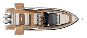 Monta fino a 2 motori da 250 CV e la sua tenuta in mare è spettacolare, questa barca è fatta per andar veloce, senza tralasciare il look contemporaneo e sportivo che la caratterizza. Il parabrezza in vetro e il T-Top proteggono gli ambienti esterni che possono essere trasformati secondo le proprie esigenze: lo schienale di poppa diventa un grande prendisole, la terrazza laterale estende il pozzetto verso il mare, la nuova cucina esterna permette di cucinare e godersi i momenti più belli in compagnia, grill e frigorifero ora si possono montare insieme con mobili d’appoggio opzionali.