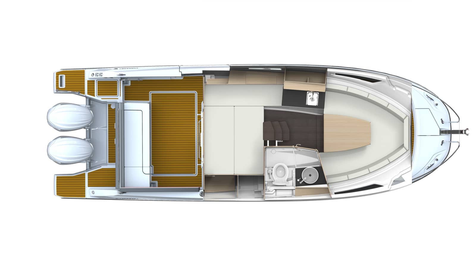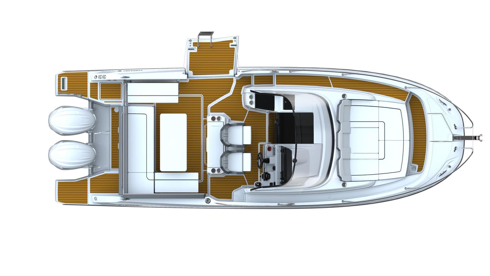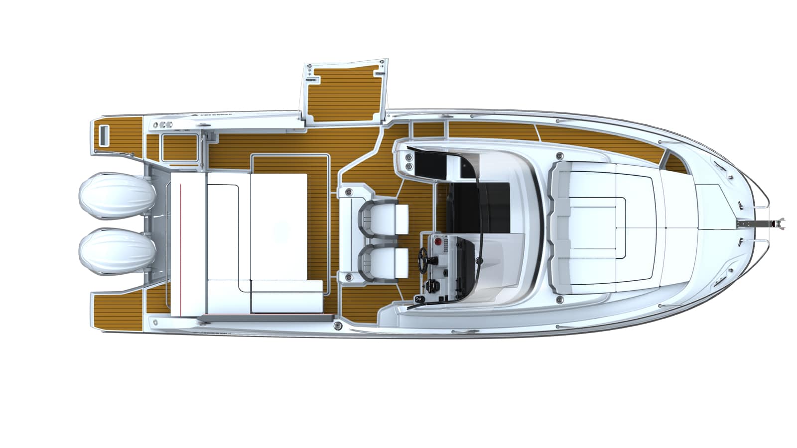 Monta fino a 2 motori da 250 CV e la sua tenuta in mare è spettacolare, questa barca è fatta per andar veloce, senza tralasciare il look contemporaneo e sportivo che la caratterizza. Il parabrezza in vetro e il T-Top proteggono gli ambienti esterni che possono essere trasformati secondo le proprie esigenze: lo schienale di poppa diventa un grande prendisole, la terrazza laterale estende il pozzetto verso il mare, la nuova cucina esterna permette di cucinare e godersi i momenti più belli in compagnia, grill e frigorifero ora si possono montare insieme con mobili d’appoggio opzionali.