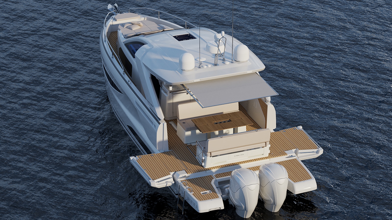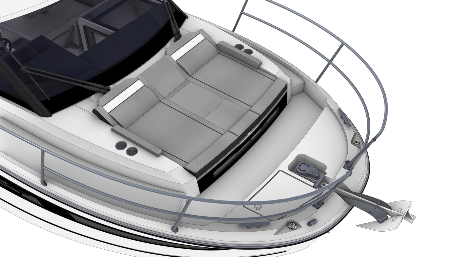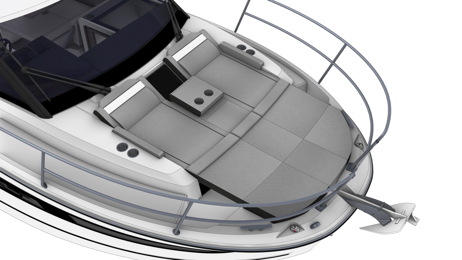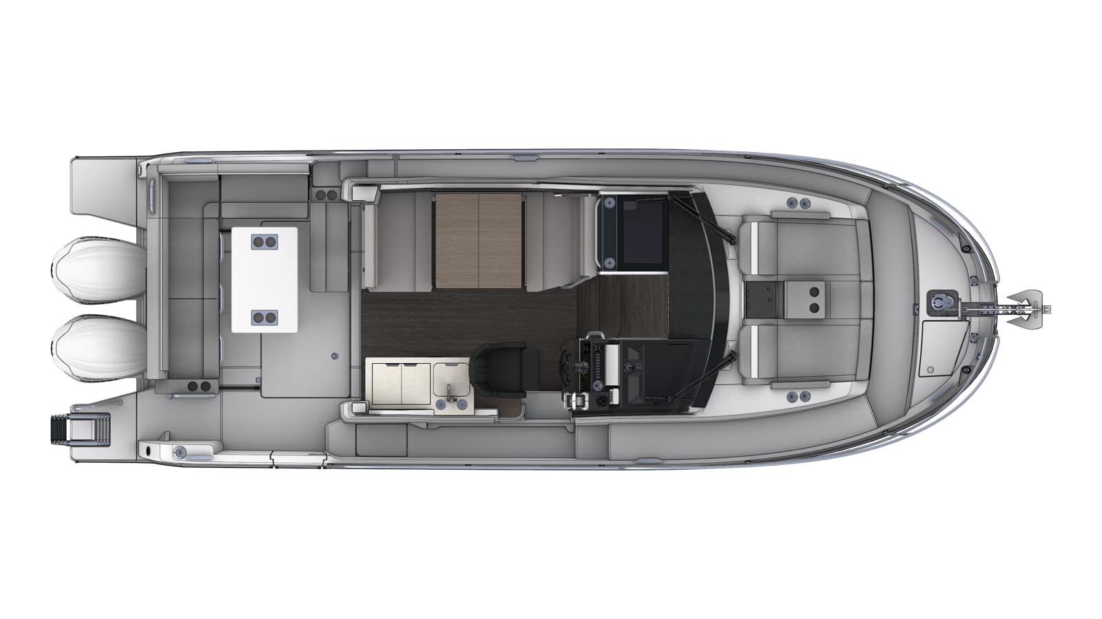 Monta fino a 2 motori da 250 CV e la sua tenuta in mare è spettacolare, questa barca è fatta per andar veloce, senza tralasciare il look contemporaneo e sportivo che la caratterizza. Il parabrezza in vetro e il T-Top proteggono gli ambienti esterni che possono essere trasformati secondo le proprie esigenze: lo schienale di poppa diventa un grande prendisole, la terrazza laterale estende il pozzetto verso il mare, la nuova cucina esterna permette di cucinare e godersi i momenti più belli in compagnia, grill e frigorifero ora si possono montare insieme con mobili d’appoggio opzionali.