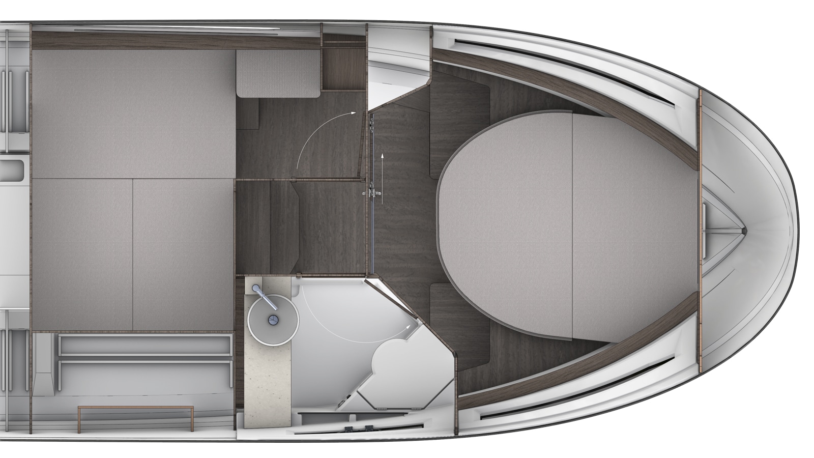 I layout, modulabili, offrono ampi spazi esterni con un livello di funzionalità impareggiabile su un’imbarcazione da 8 metri. Il portellone laterale apribile facilita l’accesso al molo o ad una banchina, il pozzetto a U con panca pieghevole e grande frigorifero permette agli ospiti di vivere intensi momenti di relax a bordo. Novità a bordo di questo esemplare è il pozzetto di prua, così da garantire sicurezza e fluidità di movimento in barca: il comfort infatti, è uno dei principali obiettivi di quest’ imbarcazione. Anche negli interni la comodità è la regina degli ambienti, che si presentano caldi ed accoglienti, ampie vetrate, una cucina spaziosa, due cabine separate e un bellissimo spazio per mangiare interno, potendo usufruire della barca anche in periodi diversi dall’estate e magari con cattivo tempo.