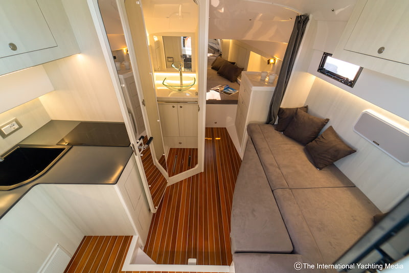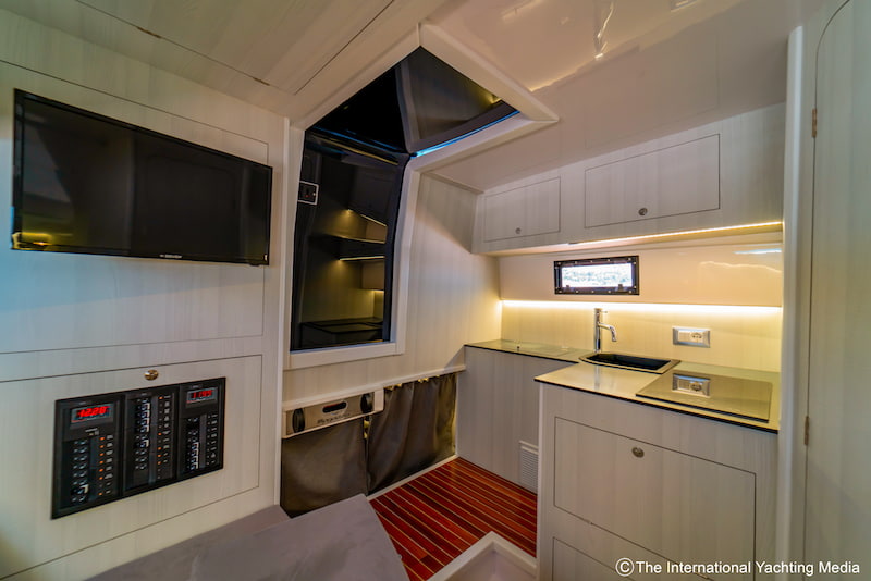 Magazzù MX-14 Classic interniMagazzù MX-14 Classic CucinaUna volta sceso posso anche ripiegare la scaletta e farla sparire, aumentando ancor più la sensazione di spazio che questo ambiente regala. A sinistra una cucina e a dritta un divano, entrambi ad L, incorniciano un corridoio che porta alla cabina di prua.