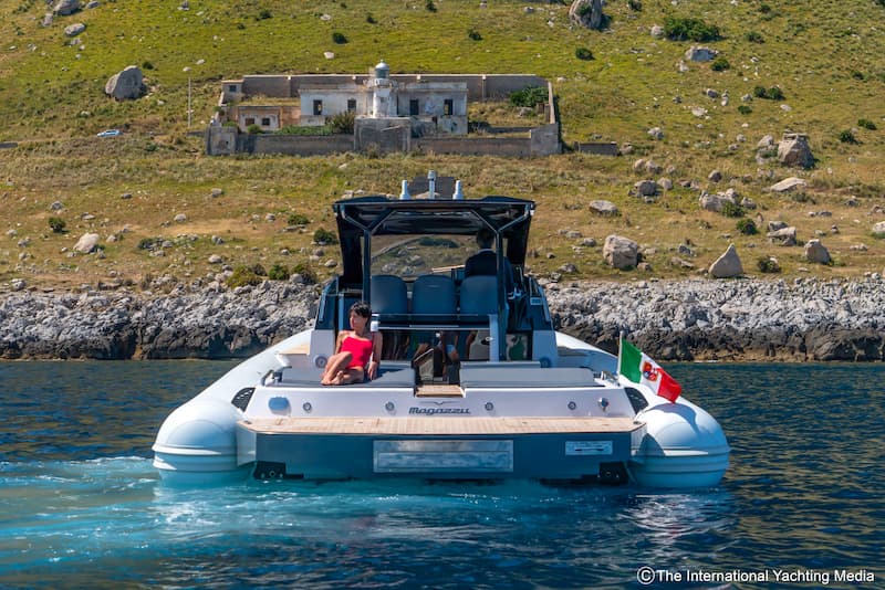 Rallento fino a 35 nodi, la massima velocità di crociera, e qui comincio a darci dentro, cercando di metter in difficoltà il Magazzù MX-14. Viro velocemente e lo sbandamento aumenta, il gommone non accenna a sbavare la scia. Controviro ma l’unico effetto che ottengo è il divertimento dei passeggeri che, come me, se la stanno godendo alla grande.