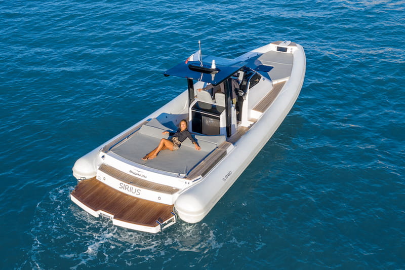 Quella di poppa merita un discorso a se. Magazzù è riuscito a realizzare, in soli undici metri di maxi-rib, una vera e propria beach area, dove la spiaggetta di poppa ed il prendisole formano un’area dove il contatto con il mare è prezioso, elegante, unico.
