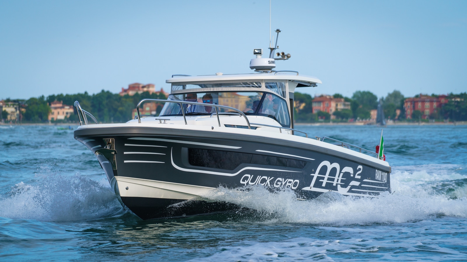 veniceLa barca scelta per dare dimostrazione delle immense potenzialità di questa tecnologia è un walkaround Nimbus, modello T11, un day-cruiser adatto a tutte le esigenze, facile da usare e molto manovrabile, che può ospitare fino a 12 persone. Monta una doppia motorizzazione Mercury 300 HP V8, che assicura una potenza e una velocità più che sufficiente per testare al meglio lo stabilizzatore giroscopico MC² Quick Gyro.