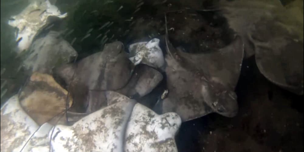 Nei video è documentata una strage di pesci simili alle razze o ai trigoni.