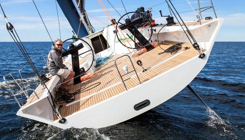 Questo tipo di barche sono definite monomarani, più che monoscafi. È come se fossero due semibarche, una destra e una sinistra, unite longitudinalmente, la prima una pensata per navigare sbandata di 20 gradi mure a dritta, la seconda 20 gradi mure a sinistra. Quindi un timone per la barca di dritta e uno per quella di sinistra.