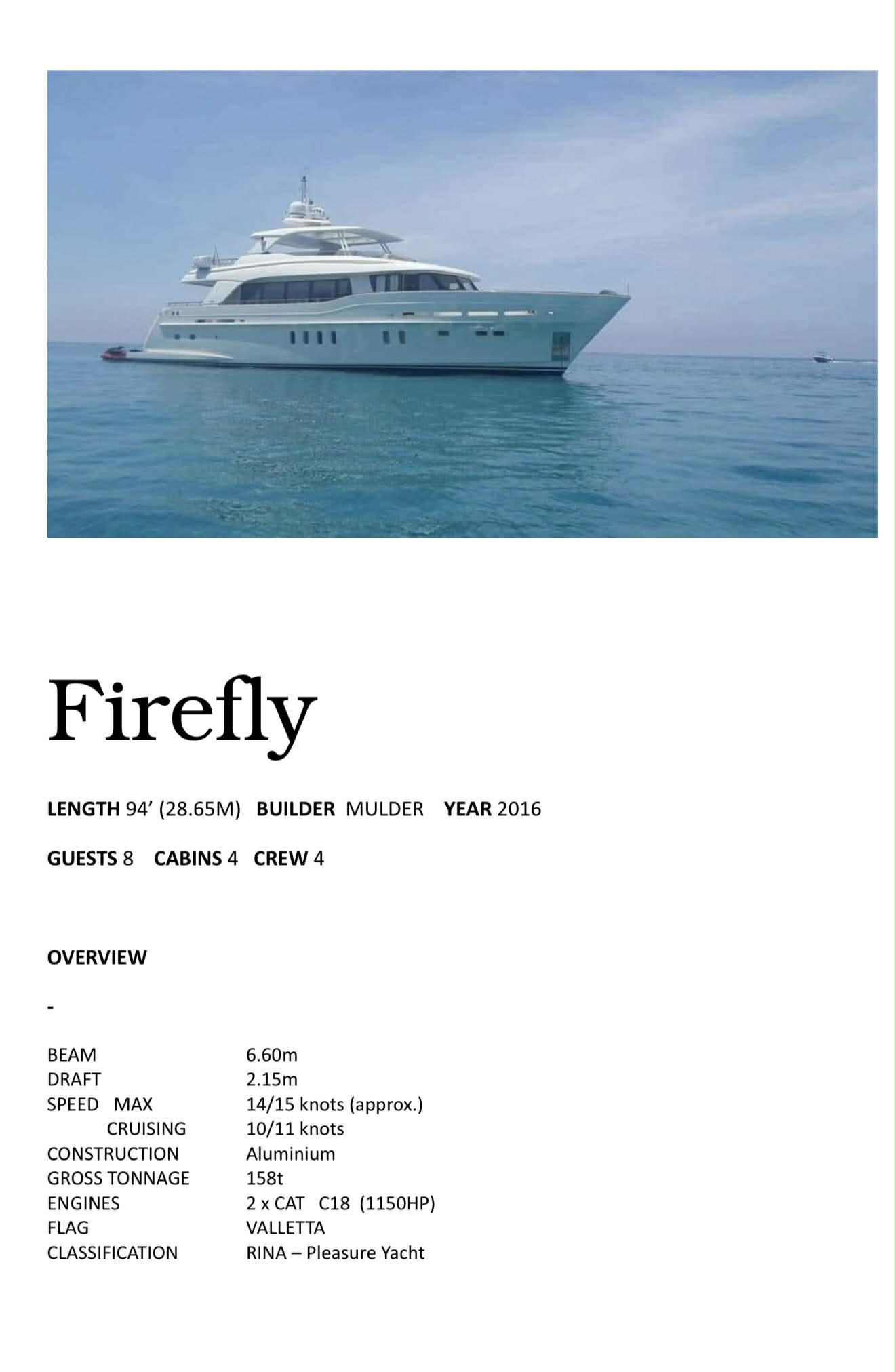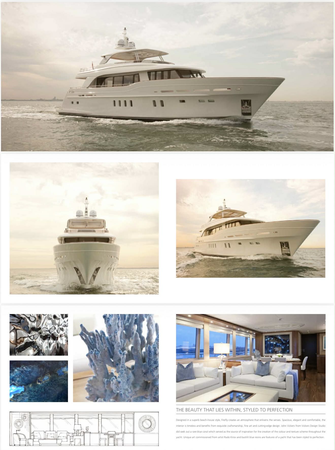 Si presenta con: Cabina armatoriale (ponte inferiore) composta da Letto king size – cabina armadio – bagno privato; Cabina VIP (ponte inferiore) composta da Letto king size – armadio – bagno privato; Cabina ospiti sinistra (ponte inferiore) composta da 2 letti – armadio – bagno privato; Cabina ospiti destra (ponte inferiore) composta da 2 letti – armadio – bagno privato;